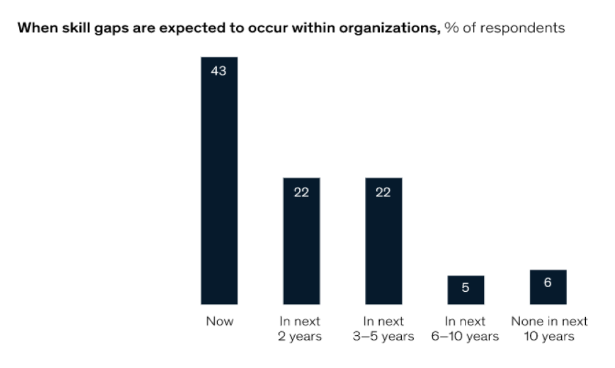 Quase nove em cada 10 empresas em todo o mundo (87%) dizem ter uma lacuna de competências – ou terão uma nos próximos anos. Se não for trabalhada, esta lacuna será gigantesca em 2030, revela a McKinsey. A empresa estima que cerca de 375 milhões de trabalhadores no globo vão precisar de mudar de categoria profissional – e desenvolver competências para serem eficazes nas novas funções.