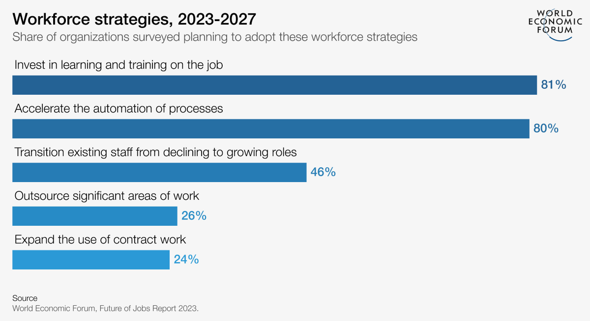 No sentido de atingirem as metas de negócios nos próximos cinco anos, as empresas analisadas pelo “Future of Jobs Report 2023”, do Fórum Económico Mundial, indicam por uma ampla margem que as estratégias que a adotar para as suas forças de trabalho envolvem investir na aprendizagem e na formação no trabalho dos seus colaboradores, bem como acelerar a automatização de processos. Quatro em cada cinco entrevistados esperam implementar estas estratégias, que surgem em primeiro e segundo lugar em todos os setores, até 2027.