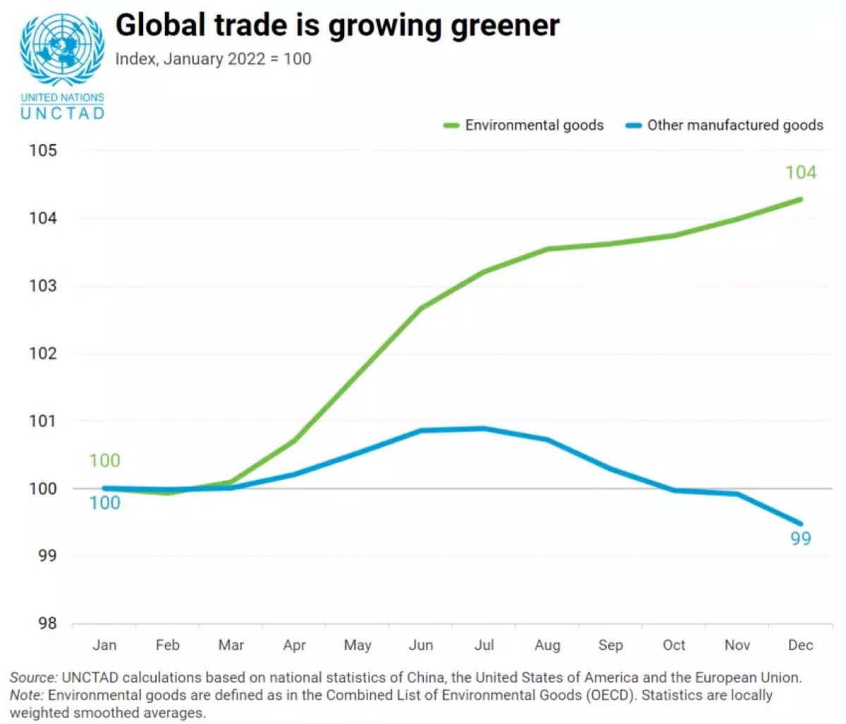 O comércio de produtos verdes teve um crescimento de 4% no segundo semestre de 2022, de acordo com a mais recente atualização do “Global Trade Update” da UNCTAD. O comércio de “produtos ecológicos” (concebidos para utilizar menos recursos ou emitir menos poluição que os equivalentes tradicionais) atingiu um recorde de 1,9 triliões de dólares em 2022, mais de 100 mil milhões em relação a 2021. Os produtos com melhor desempenho foram os veículos elétricos e híbridos (mais 25%), embalagens não plásticas (mais 20%) e turbinas eólicas (mais 10%).