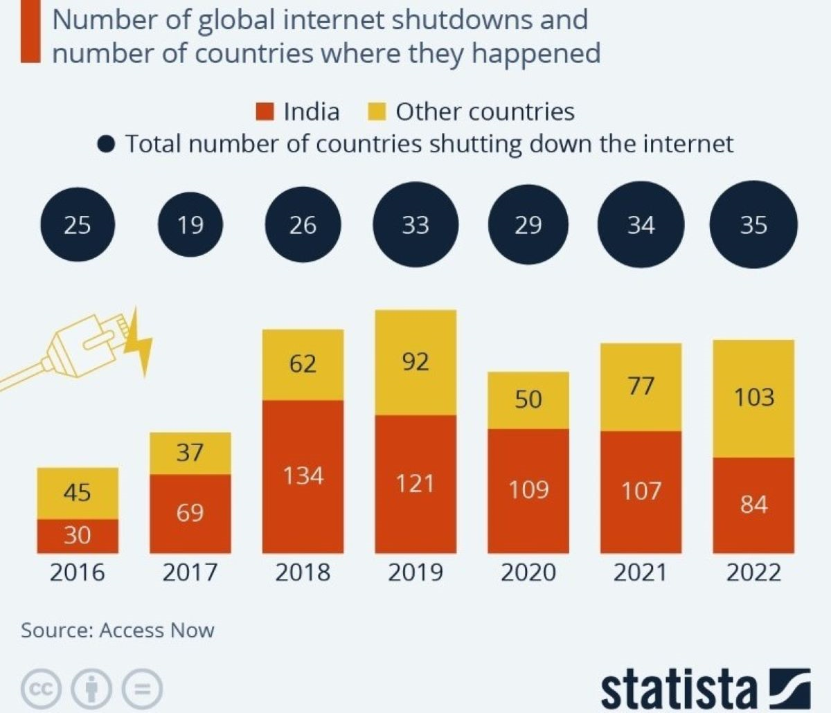Os bloqueios, ou o desligar da internet por parte de Estados, são cada vez mais frequentes: o número total de países que recorreram a este sistema aumentou nos últimos seis anos. A maioria dos bloqueios ocorre na Índia, apesar de o país ter registado o menor número de “paralisações” em 2022, de acordo com o Statista.