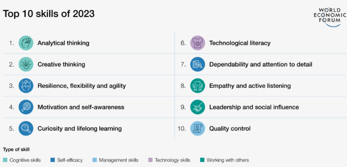 Quais as competências que vão ser mais procuradas pelo mercado nos próximos anos? No top 5 estão: pensamento analítico; pensamento criativo; resiliência, flexibilidade e agilidade; motivação e autoconsciência; curiosidade e formação contínua, de acordo com o “Future of Jobs Report 2023”, do Fórum Económico Mundial.