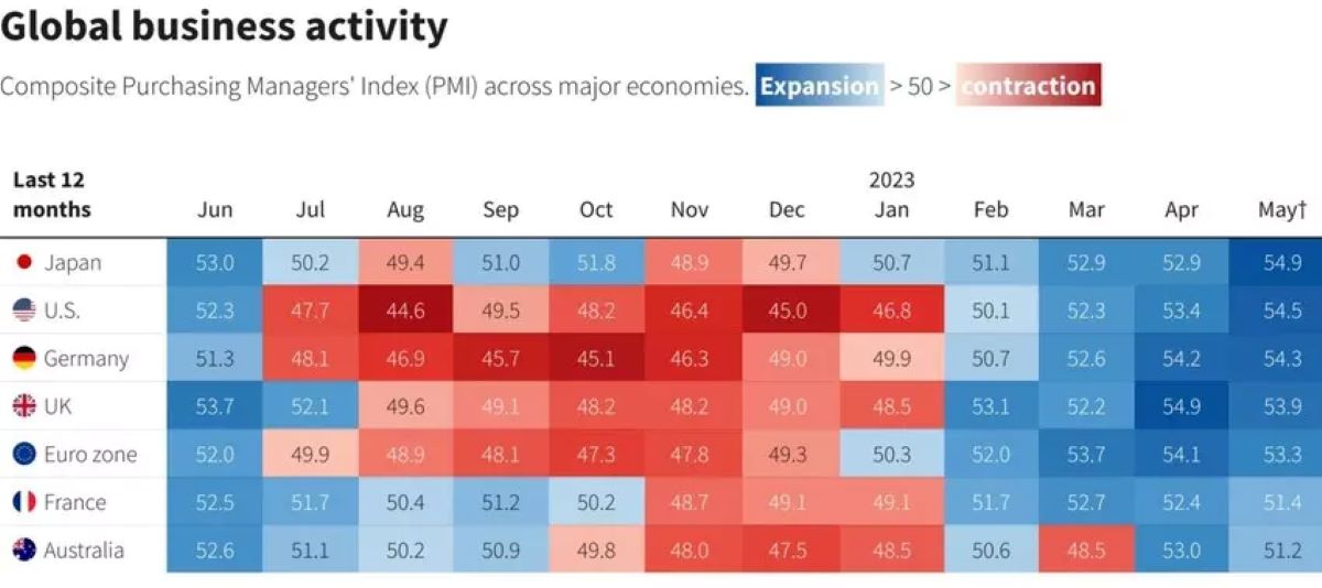 No entanto, há alguns indícios positivos. Indicadores avançados, como os Índices de Gestores de Compras para as principais economias, mostram que a atividade comercial começou a recuperar no segundo trimestre de 2023.
