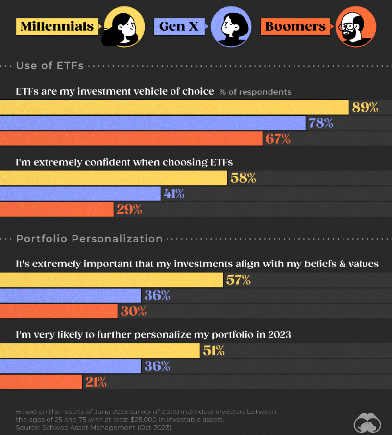 Nos EUA, a geração Y/millennials (nascidos entre 1981-96) têm maior apetência por ETF; são também os mais confiantes na escolha deste tipo de investimento, com base em dados da Charles Schwab de junho de 2023. E 57% afirmam ser extremamente importante que os seus investimentos estejam alinhados com os seus valores, mais individualistas – quase o dobro da parcela da geração baby boomer (nascida entre 1946-64).