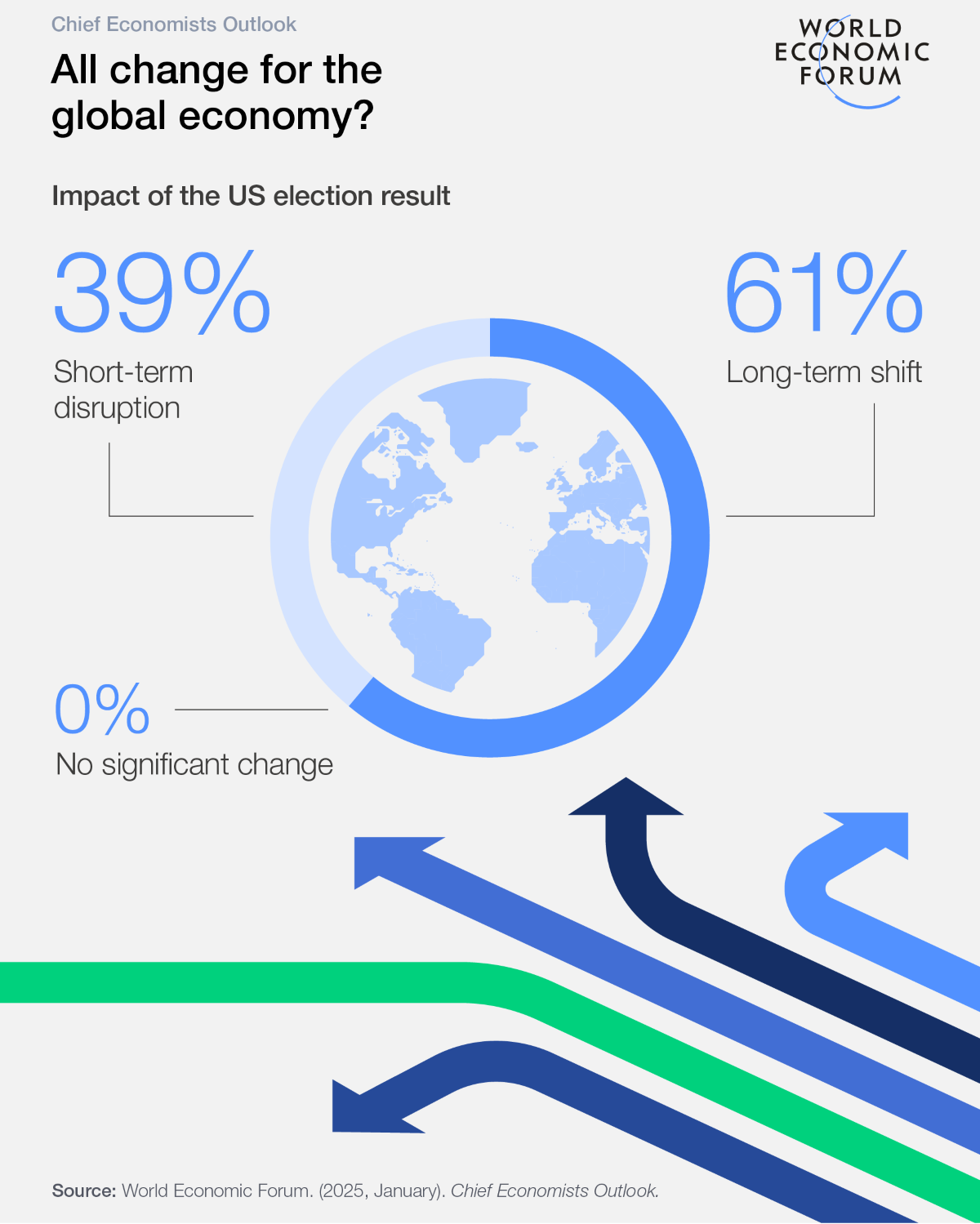 A maioria dos economistas-chefe (61%) caracteriza o impacto das recentes eleições presidenciais dos EUA para a economia global como uma mudança de longo prazo e não como uma perturbação de curto prazo (39%).