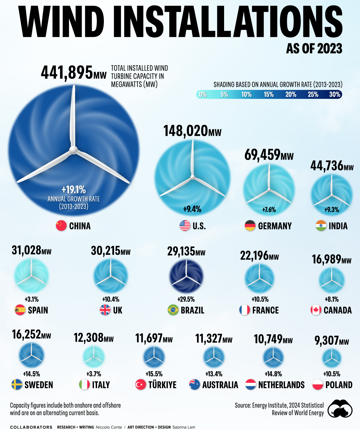 As instalações globais de energia eólica atingiram um novo máximo em 2023, aumentando para 30% a quota das renováveis na geração total de energia. A China lidera no segmento eólico, com uma capacidade de 441.895 megawatts em turbinas – quase três vezes a dos EUA, que ocupa o segundo lugar (dados do relatório “Statistical Review of World Energy 2024”, do Energy Institute).