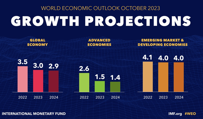 O FMI espera que o crescimento global estabilize nos 3% em 2023, antes de cair para 2,9% em 2024. No entanto, a intervenção dos bancos centrais e políticas governamentais mais rigorosas parecem proporcionar uma aterragem suave. Segundo o relatório do FMI, “os riscos estão mais equilibrados que há seis meses… a probabilidade de uma aterragem brusca diminuiu, mas o equilíbrio dos riscos para o crescimento global permanece inclinado para o lado negativo”.