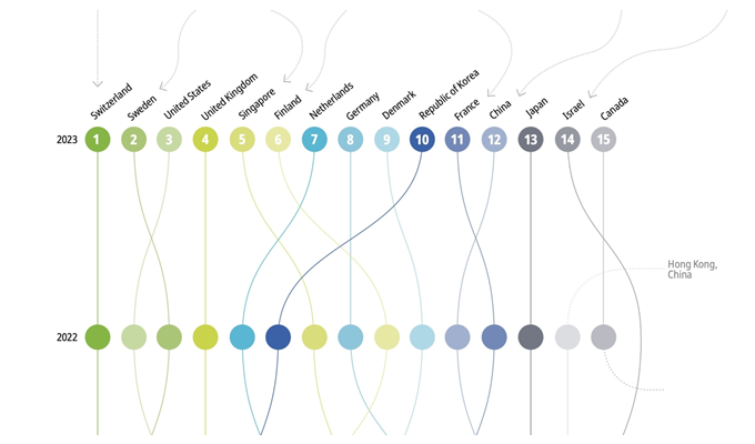 A Suíça lidera, pelo 13.º ano consecutivo, o índice de inovação da Organização Mundial de Propriedade Intelectual (Nações Unidas). O Índice Global de Inovação 2023 da Organização Mundial da Propriedade Intelectual (OMPI) classificou 15 países líderes mundiais em ciência, tecnologia e inovação. Os indicadores incluem: investimento em pesquisa e desenvolvimento (P&D), força geral do mercado, sistemas e produção de patentes, mão-de-obra local.
