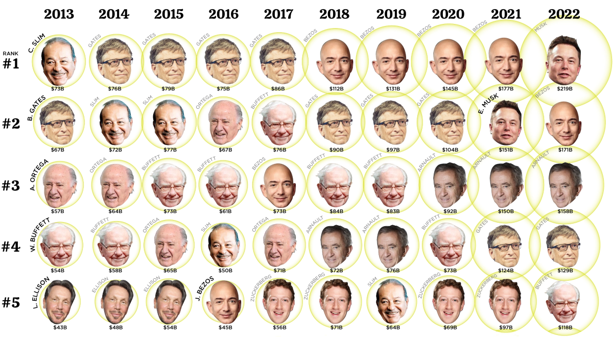 Ranking dos bilionários mais ricos em 2022, incluindo o ano em que entraram (na última década):