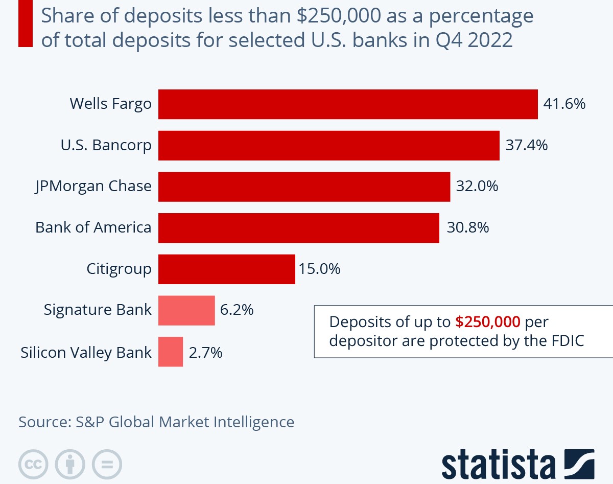 Tanto o SVB como o Signature Bank tinham uma baixa parcela de depósitos abaixo de 250 mil dólares, o que expôs os dois bancos ao risco de uma corrida ao capital.