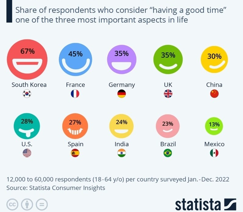 De acordo com a pesquisa realizada em 2022, os sul-coreanos estão particularmente interessados em “passar um bom bocado”, com 67% dos entrevistados a considerarem a diversão um dos três aspetos mais importantes da vida. Os resultados variam muito entre os países, indo de 13% no México a 28% nos EUA, passando por 45% em França.