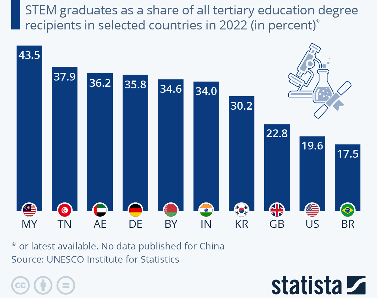 Outros países com uma quota significativa de licenciados em CTEM são os Emirados Árabes Unidos e a Coreia do Sul, enquanto a Europa Ocidental e os EUA têm números mais baixos (de notar que a UNESCO não tem dados publicados sobre a China).