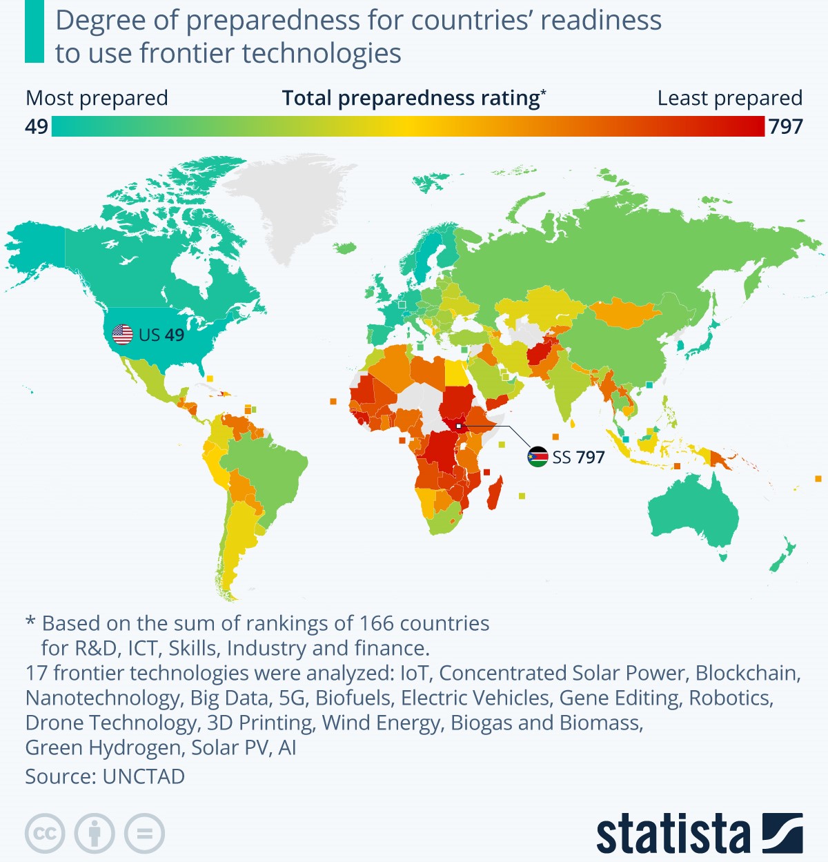 EUA, Suécia, Singapura, Suíça e Países Baixos são os cinco países (num total de 166) mais bem preparados para utilizar, adotar ou se adaptarem a tecnologias de fronteira, que serão essenciais na transição para a tecnologia verde, segundo dados divulgados pela Conferência das Nações Unidas para o Comércio e o Desenvolvimento (UNCTAD em inglês).