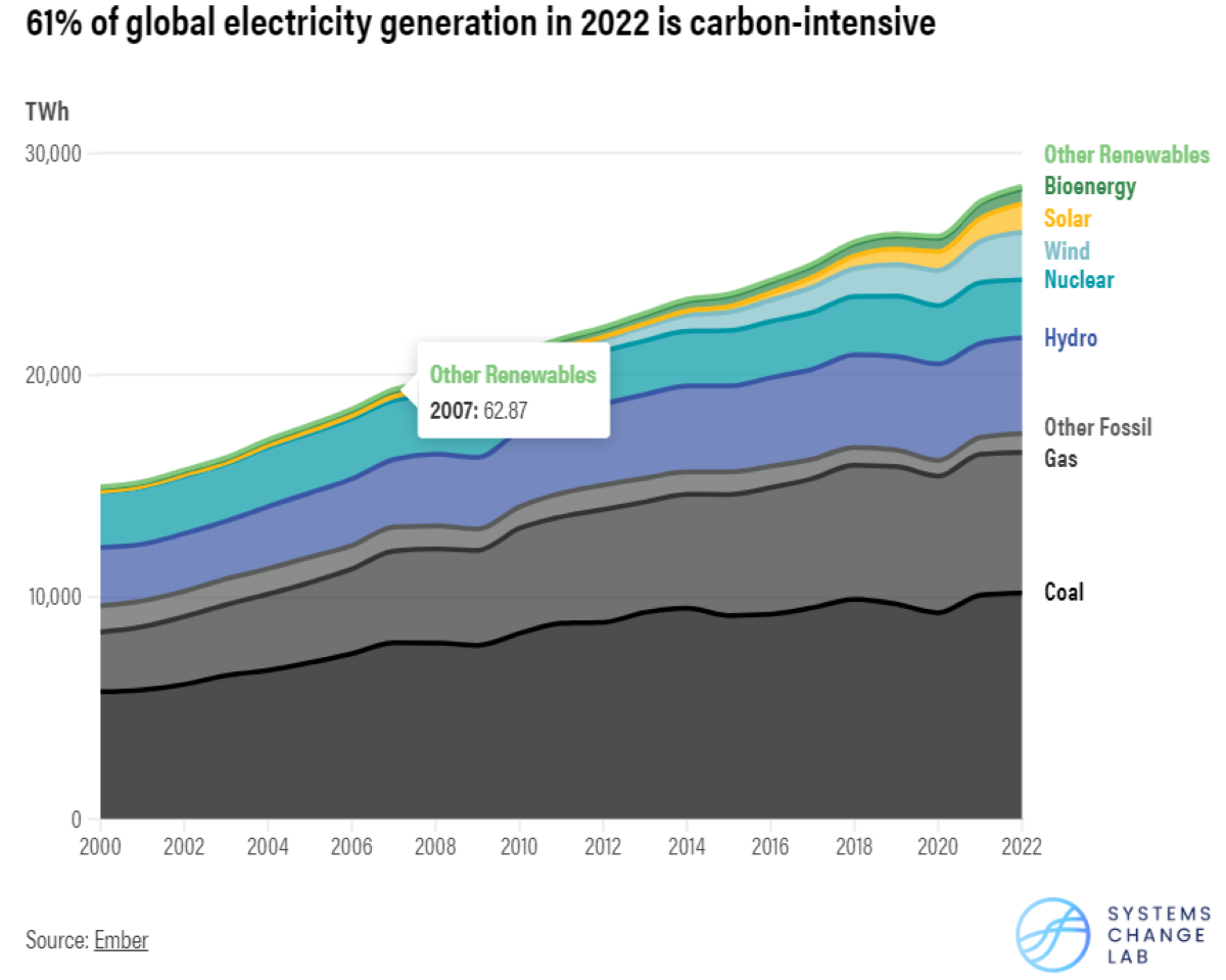 A participação do carvão na geração de eletricidade atingiu cerca de 37% em 2019, antes da pandemia de Covid-19, e continuou a crescer globalmente, sobretudo devido à crescente procura de energia, especialmente em países dependentes de carvão, como a China e a Índia.