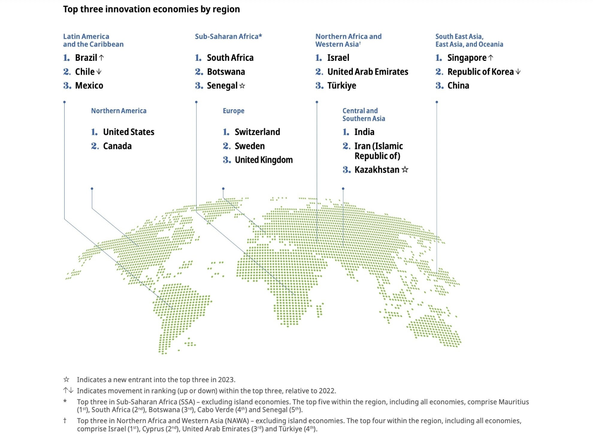 As 15 primeiras classificações no Índice Global de Inovação 2023 da Organização Mundial da Propriedade Intelectual (OMPI) contam apenas parte da história. Ao olharmos para os principais inovadores em todas as regiões, constatamos que países como a Turquia, o Senegal e o Cazaquistão se juntaram às fileiras das nações que lideram o caminho.