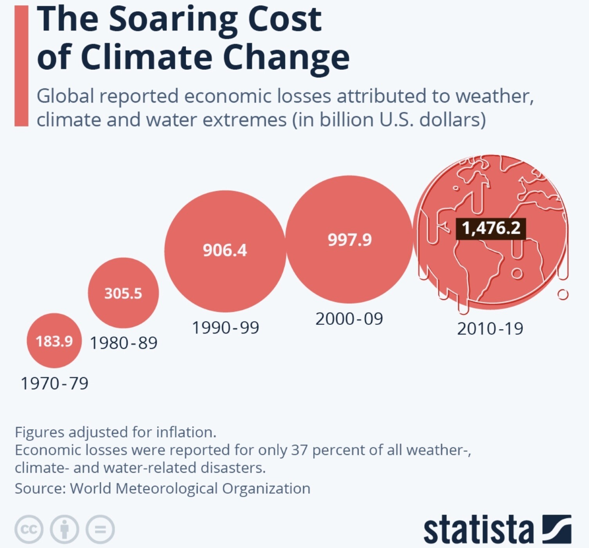 Eventos extremos relacionados com condições meteorológicas, climáticas e hídricas causaram quase 1,5 mil milhões de dólares em perdas financeiras na década até 2019, acima dos 184 mil milhões de dólares na década de 1970, segundo um relatório da OMM. E os números reais serão provavelmente ainda mais altos, dado que muitas perdas não são declaradas.