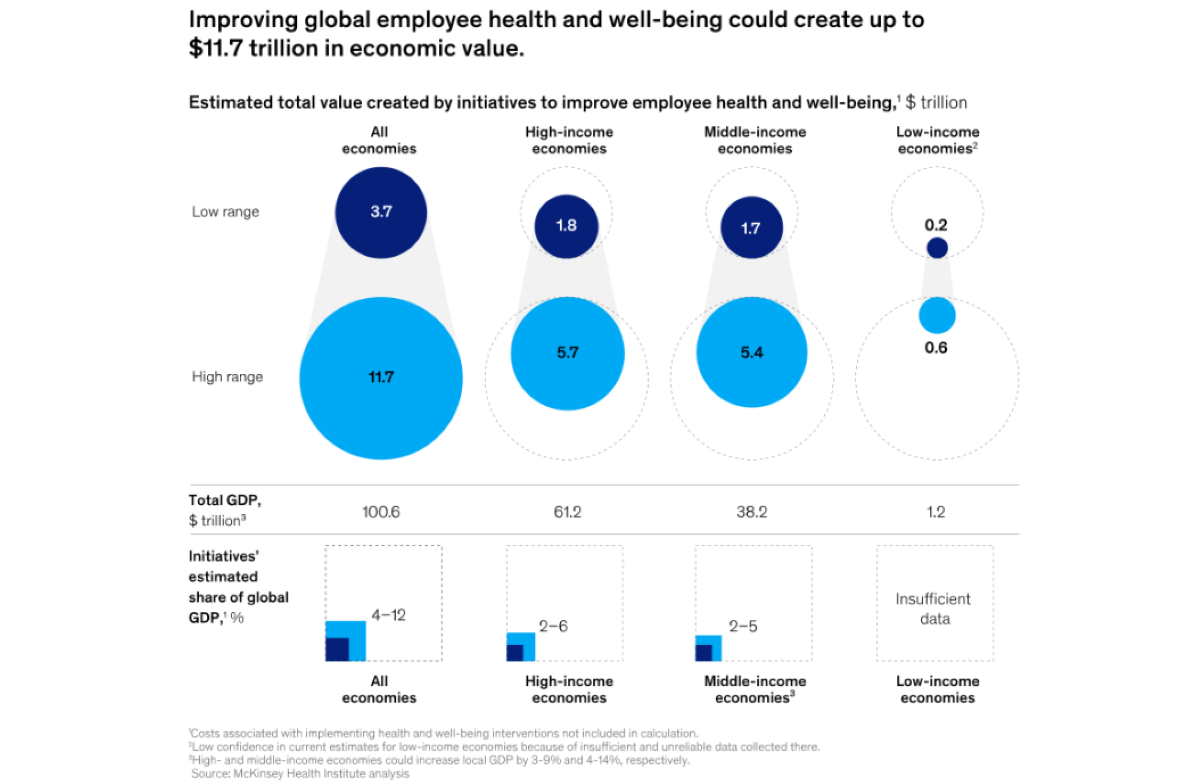 Melhorar a saúde global dos funcionários pode criar triliões de dólares em valor económico, pelo que faz sentido para as empresas investir na saúde e no bem-estar dos colaboradores. As estimativas do McKinsey Health Institute apontam para que a oportunidade global total de otimizar a saúde e o bem-estar dos funcionários seja de 3,7 mil milhões a 11,7 mil milhões de dólares, o que equivale a aumentar o PIB global entre 4 a 12%. Juntas, as economias de alto e médio rendimento representam 95% desta oportunidade total.