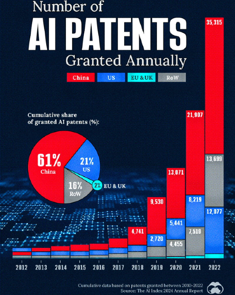 Desde então, a China tem registado um enorme crescimento no número de patentes em IA concedidas todos os anos. Em 2022 o país obteve mais patentes do que todas as outras nações juntas. Embora tal sugira que a China é muito ativa em investigação em inteligência artificial, não significa necessariamente que é o país mais avançado em termos de capacidade.