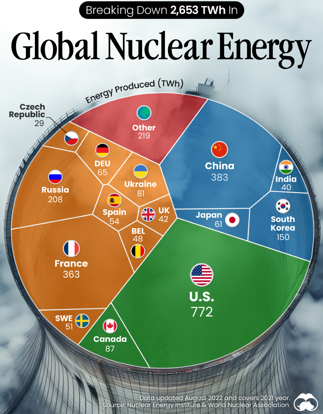 A produção de energia nuclear nos EUA é mais do que o dobro da quantidade produzida pela China (em 2.º lugar) e pela França (3.º) juntas. No total, os EUA são responsáveis por quase 30% da produção global de energia nuclear – dados do Instituto de Energia Nuclear, atualizados pela última vez em agosto de 2022 (com a energia medida em terawatts-hora (TWh)).