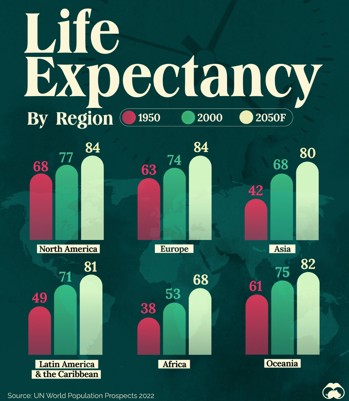 No início do séc. XIX nenhum país tinha uma esperança de vida superior a 40 anos, em que grande parte da população mundial enfrentava a pobreza extrema, tinha acesso limitado a cuidados médicos e falta de saneamento. Desde então a esperança de vida aumentou substancialmente em todo o mundo. Nomeadamente, entre 1950 e 2000, deram-se progressos significativos na Ásia, na América Latina e nas Caraíbas.