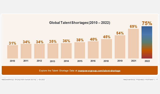 Dados do ManPower Group indicam que 3 em cada 4 empregadores (75%) tiveram dificuldade em encontrar o talento de que precisavam em 2022, o valor mais alto em 16 anos; representa ainda um aumento de ...